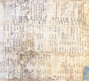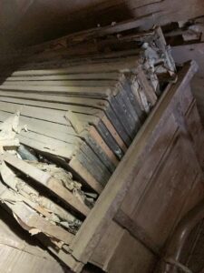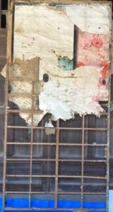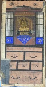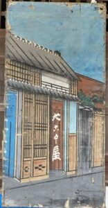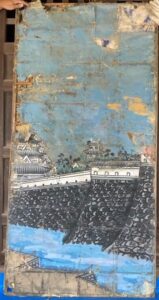 この絵以外にも、「お城」「障子」「仏間」「町の風景」等50枚ほどの書き割りが出てきたが、かなりボロボロで、中には絵具同士がくっついてしまい、はがせない物もありました。