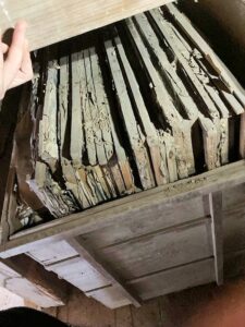 舞台奥から出てきた長持二挺に襖のようなものがしまってあり、そこに絵が描いてある様子であったため、歌舞伎舞台背景襖絵と推察し、二川本陣資料館の鶴田さん、多米民俗資料館の元室長の大竹さん、古物商の鈴木さん、裏山文庫の山崎さん等に立会いいただき、調査を行いました。