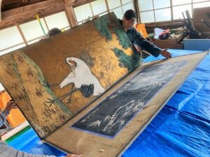 湿気と埃で襖同士が張り付いた状態であったり、虫やネズミの被害でボロボロになっていたので、取り出せるか心配でしたが、状態の良さそうなところから2枚同時にそっと取り出し、表面の絵が剥がれないよう慎重にひらいてみたところ、思った以上にしっかりとした鶴の絵と掛軸のような絵が現れ、参加者から「お~」と声が出ました。